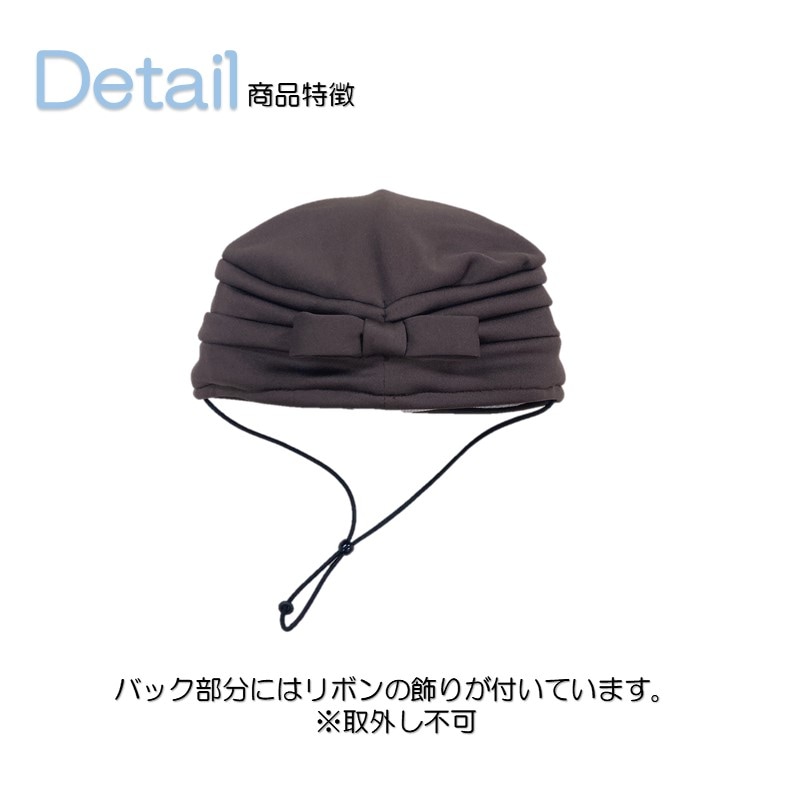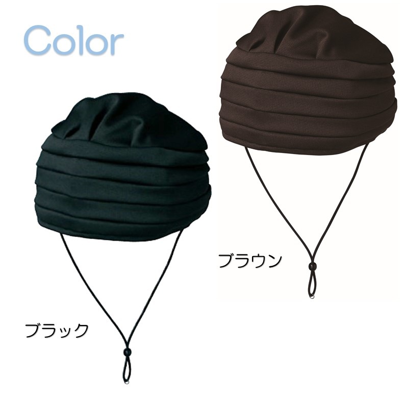 つばがないので屋外でも室内でもご使用いただける汎用性の高いタイプです。あごひもはゴム製です。