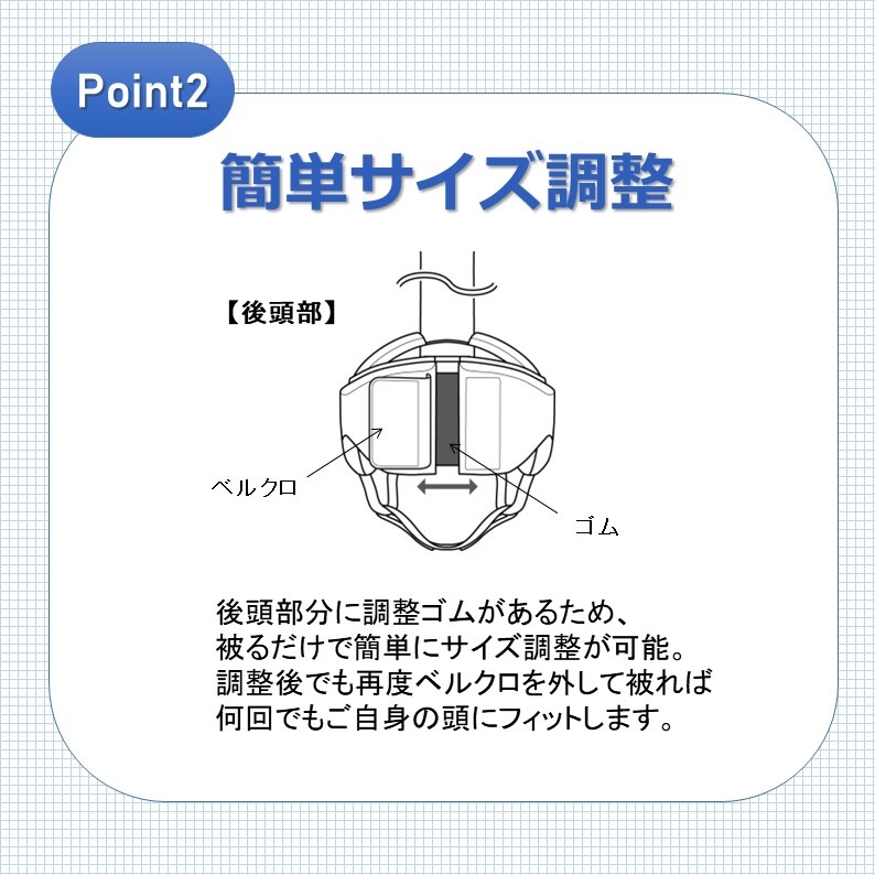 頭頂部と後頭部で自由にサイズ調整が可能で、軽量かつ通気性に優れ、丸洗いにも対応。