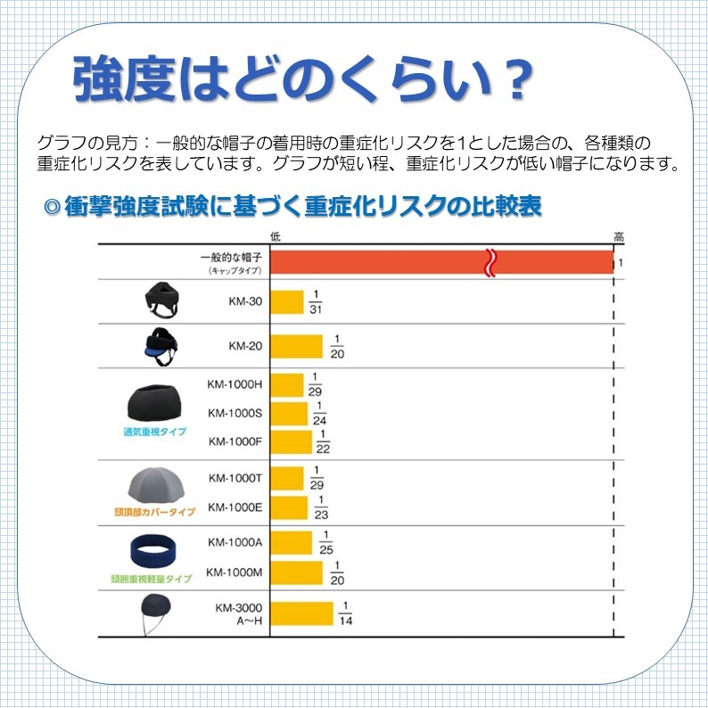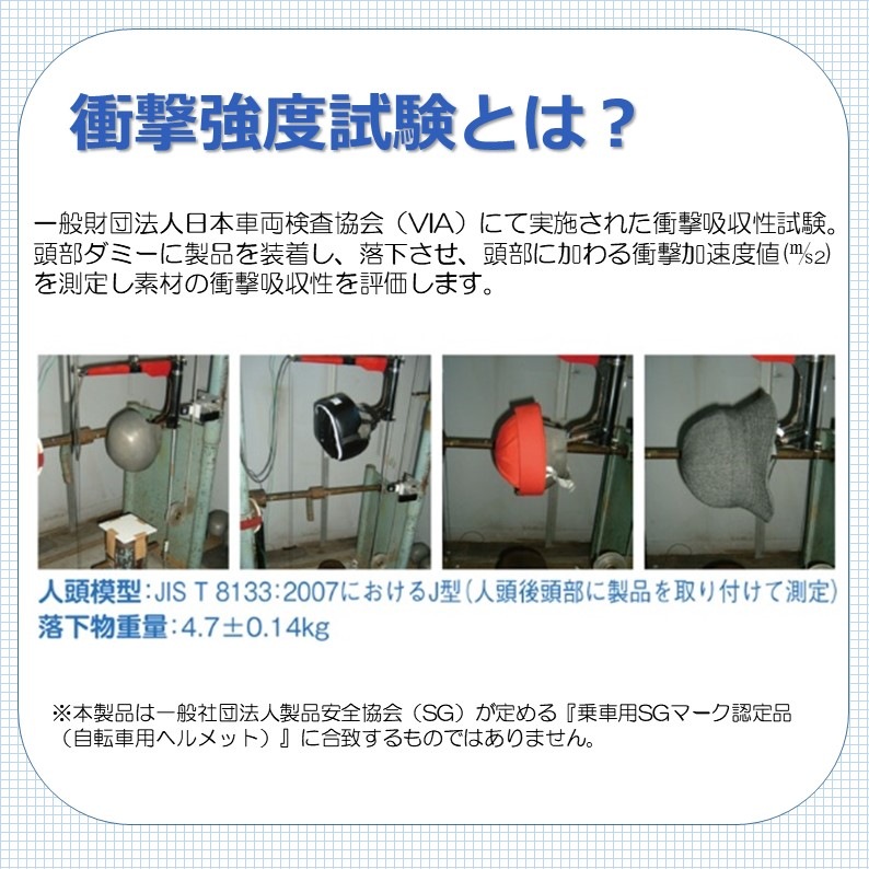 ※1 財団法人日本車両検査協会(VIA)にて実施。頭部ダミーに製品を装着後、一定の高さから落下させ、頭部に加わる衝撃加速度値(m/s2)を測定し素材の衝撃吸収性を評価します。